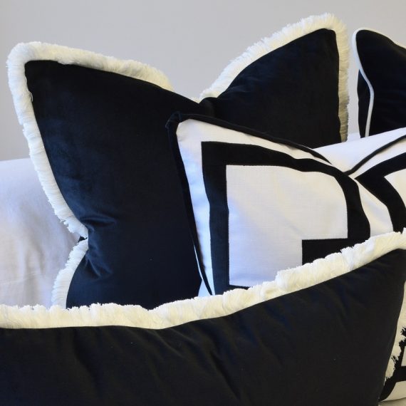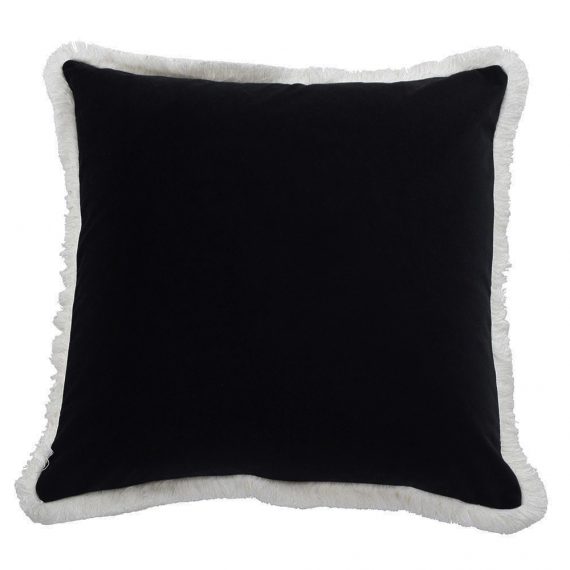 Plush black velvet and elegant white fringing create a timeless cushion that will elevate any setting.