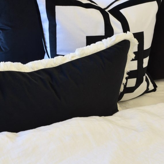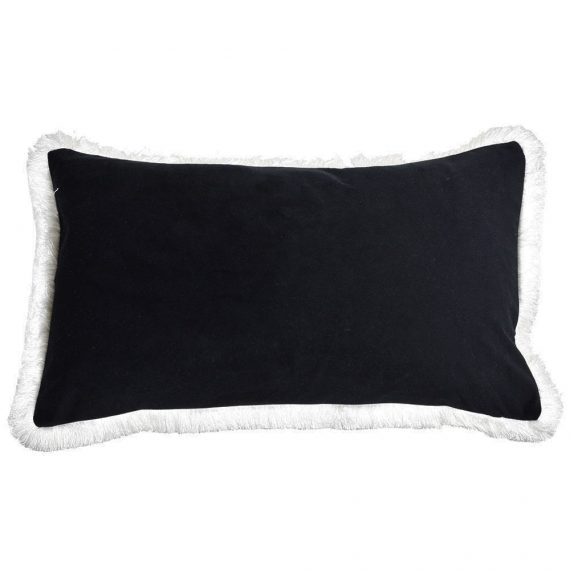 Plush black velvet and elegant white fringing create a timeless cushion that will elevate any setting.