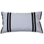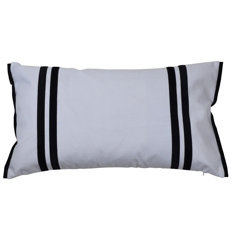 A classic striped applique lumbar cushion with flanged ends and velvet backing combined beautifully with crisp white cotton.