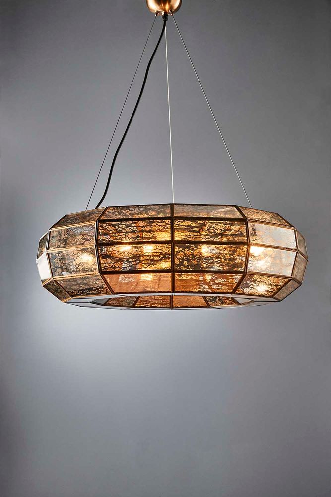 Introducing our Victoria small hanging lamp in brass, a stunning addition to any living space. Crafted with a beautiful bronze metal cage and mercuried glass, this pendant offers two different looks when switched on or off. The light shines through the distressed accents in the glass, creating a glowing effect. The suspension cord is adjustable with a metal string to ensure the pendant hangs levelled.